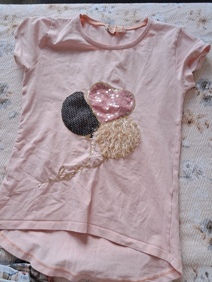 Pembe kısa kollu kız çocuk tişörtü, yuvarlak yaka, bol kesim ve payetli balon desenli. Yumuşak kumaştan, rahat kullanımlık.