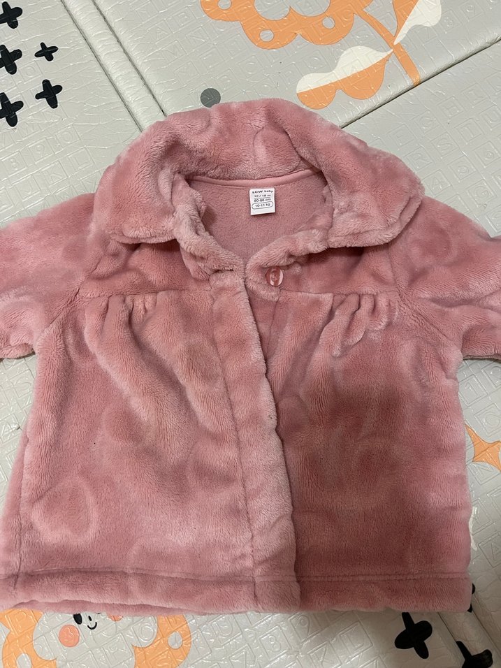 Gevşek kesim, pastel pembe renkli, yakalı ve peluş detaylı kız çocuk ceketi, desensiz ve sade tarzda.
