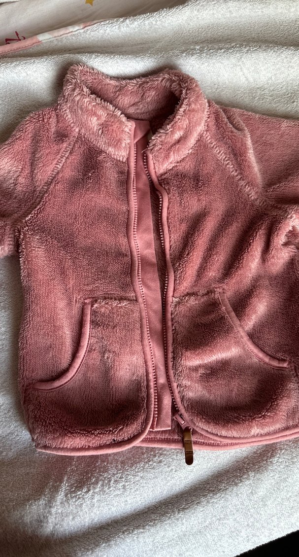 Kız çocuklar için pembe, peluş kumaşlı, kürk detaylı, fit kesim ceket. ön cepleriyle rahat sokak stili sunar.