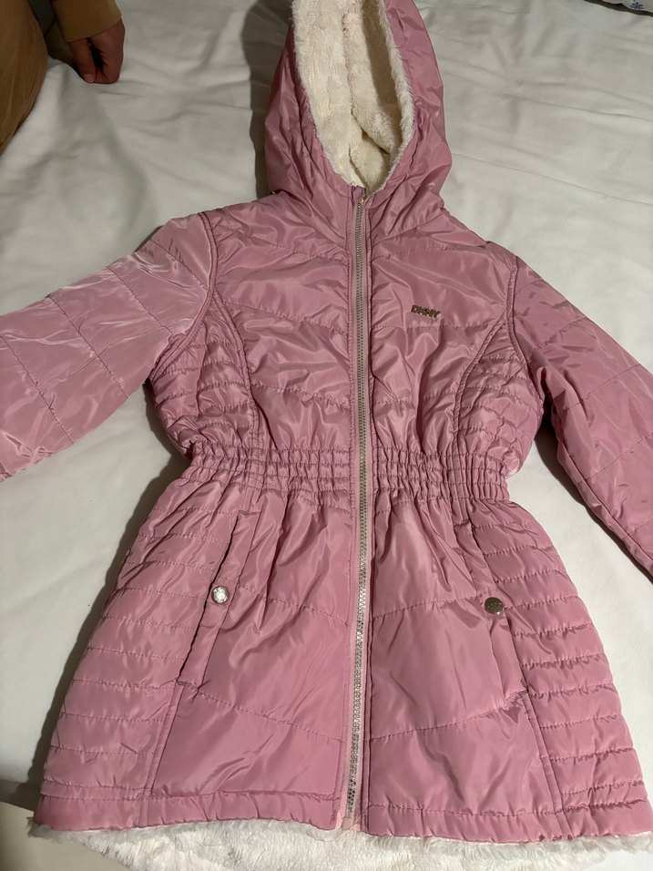 Fitted kesim, kapüşonlu ve peluş astarlı, notched lapel yakalı pembe mont, sokak stili için uygundur. DKNY çift taraflı kız çocuk mont 9 10 yaş orijinal