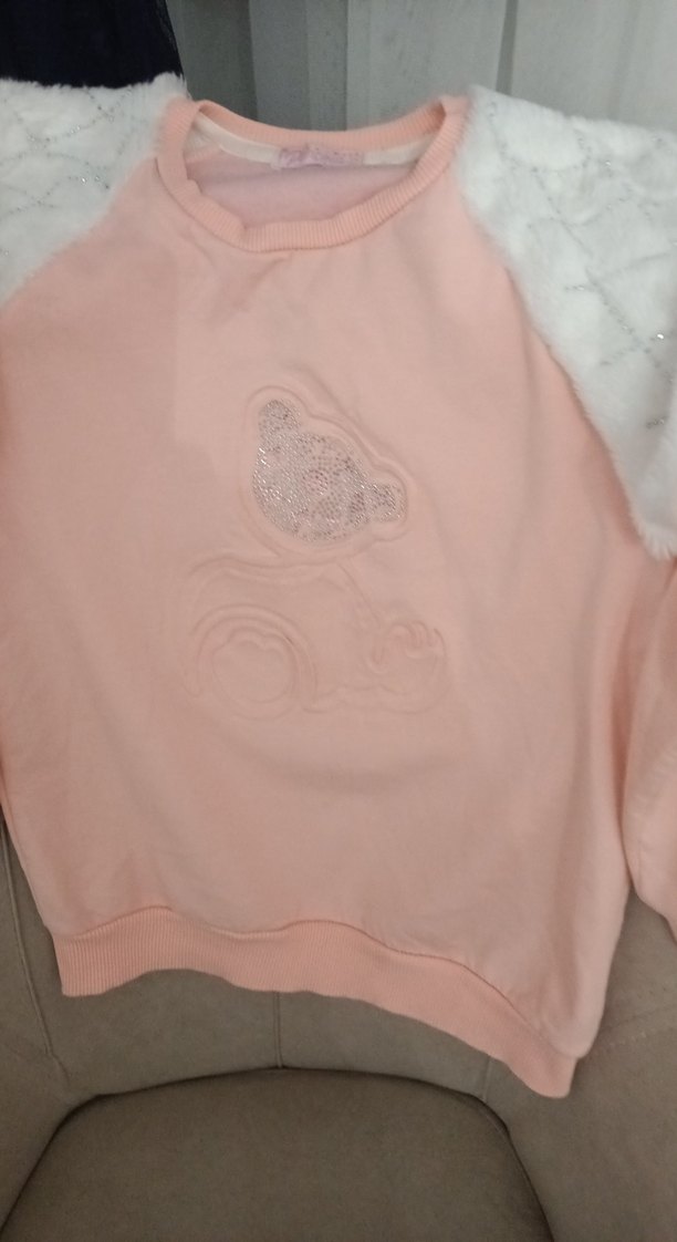 Pembe pastel renkli, uzun kollu, yuvarlak yakalı kız çocuk sweatshirtü. Peluş detaylı ve baskılı, bol kesim rahat bir tasarım sunar.