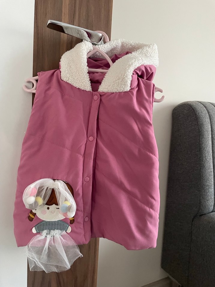 Kız çocukları için pastel pembe, peluş detaylı, işlemeli desenli, kolsuz ve dar kesim yelek. Sokak modasına uygun rahat stil.