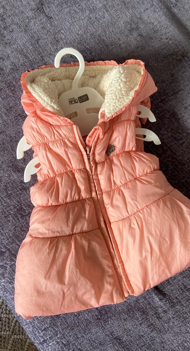 Kız çocuklar için pastel pembe renkli, nakış detaylı, straplez yaka ve peluş detaylı, yumuşak ve sıcak kumaştan yapılmış ince kesim yelek. Trend sokak giyimi için uygun.