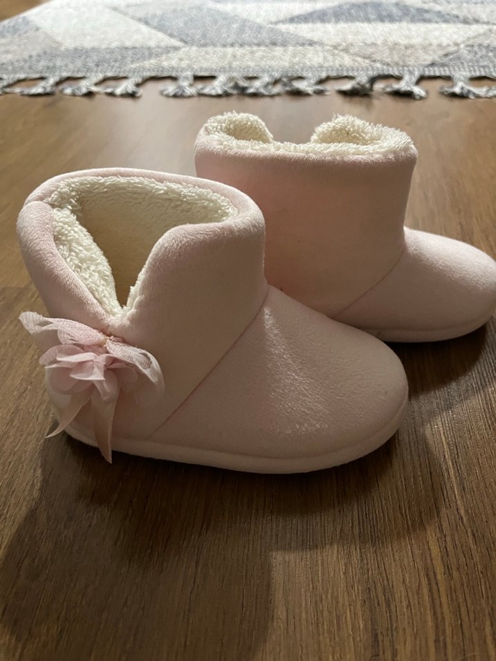 Kız çocukları için pembe peluş ev botu, yumuşak dış yüzey ve içi kürklü yapısıyla sıcaklık sağlar. Yanında zarif fiyonk detayı bulunur.