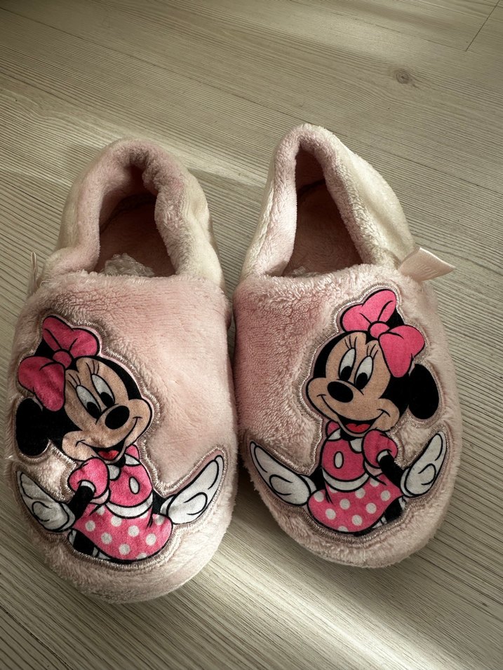 Kız çocukları için pembe, yumuşak kürklü ve baskılı Minnie Mouse desenli sıcak ev terliği. Geleneksel tarzda, pastel tonlarda.