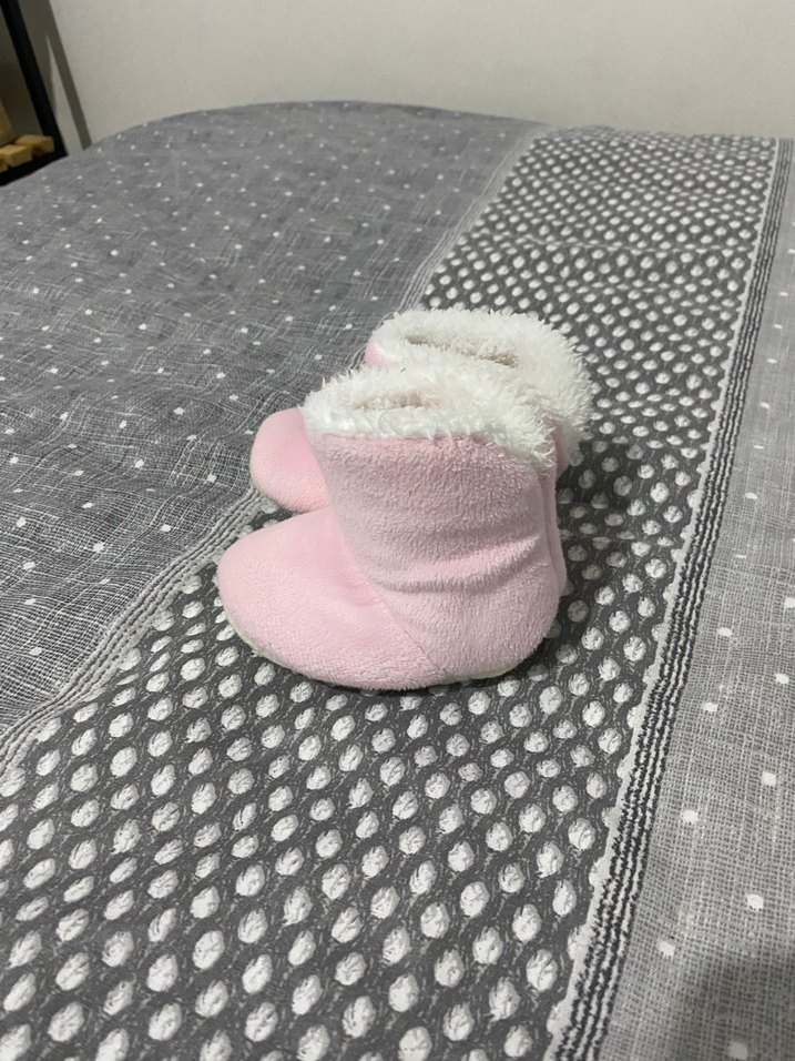 Kız çocukları için yumuşak pembe dış yüzeyli ve peluş kürk detaylı sıcak ev terliği. Basit, pastel tasarımı günlük kullanım için uygundur.