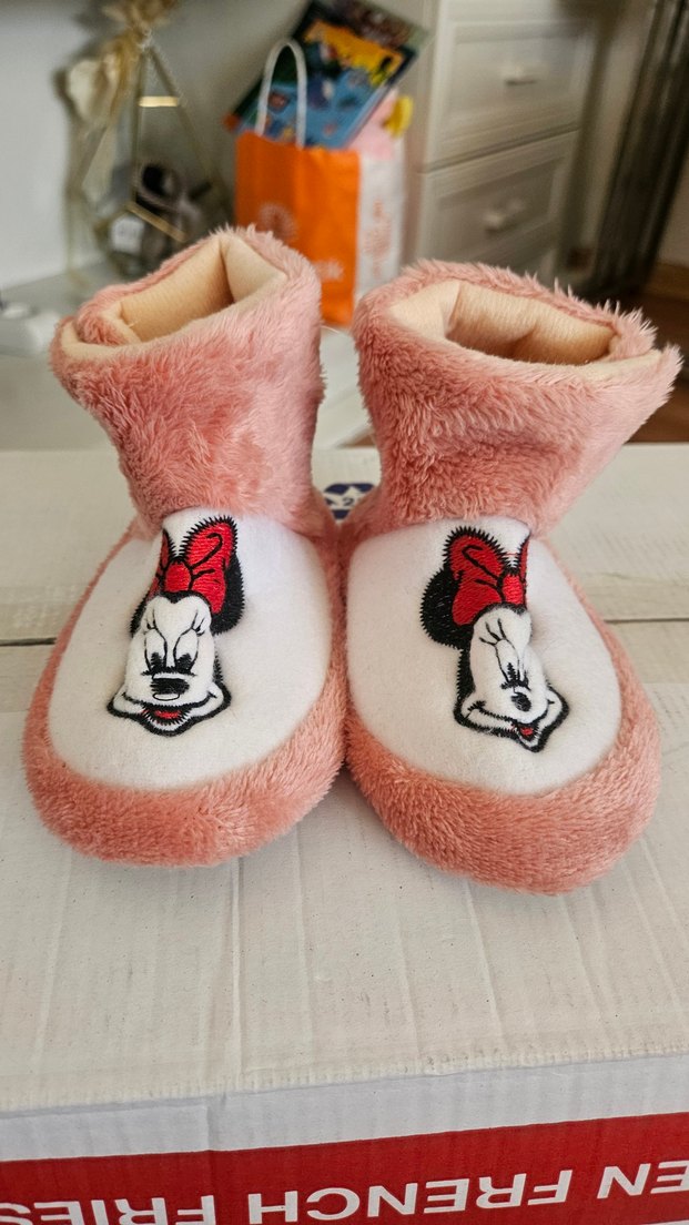 Kız çocuklar için pembe peluş terlikler, renkli işleme pop kültür desenleri ve yumuşak kürk detaylarıyla ekstra sıcaklık sağlar. 19-20 numara