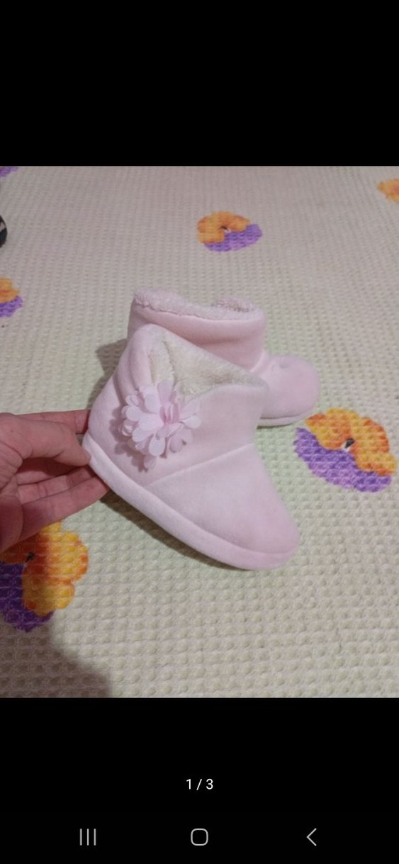 Kız çocukları için pastel pembe renkli, yumuşak peluş kumaştan yapılmış, çiçek desenli fırfırlı sıcak ev terliği.