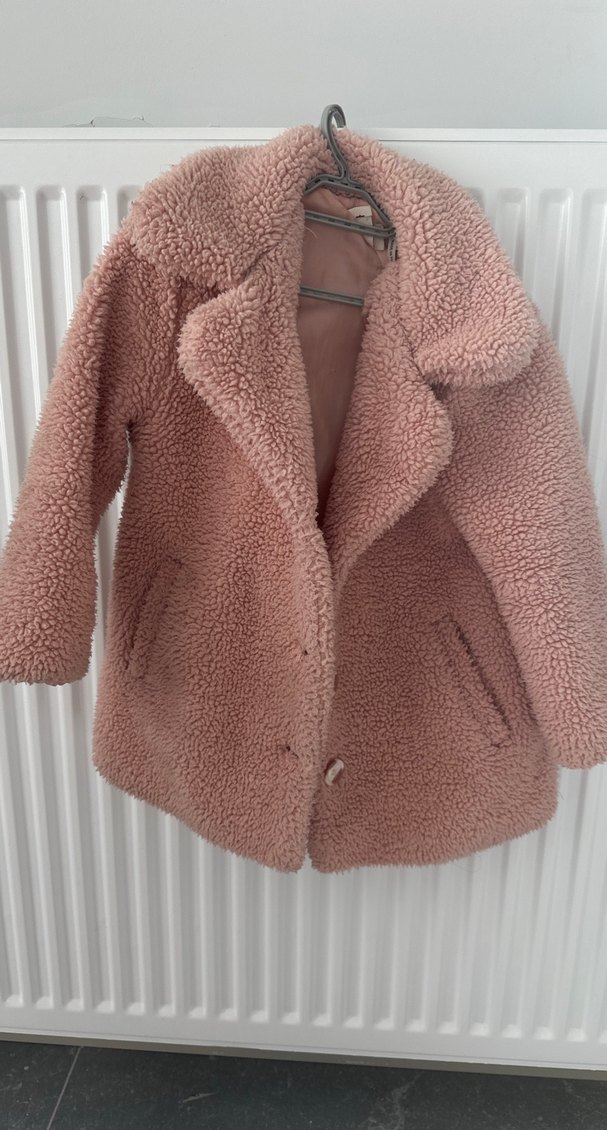 Notlu yaka ve peluş detaylı, gevşek kesim pembe kız çocuk kabanı. Pastel tonuyla trend rahat stil sağlar. 4-5 yaş