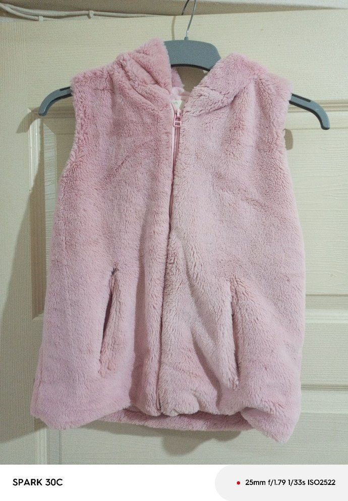 Pembe pastel renkte, yumuşak peluş kumaştan yapılmış kız çocuk yeleği. V yaka, kolsuz ve fermuarlı, cepli, sokak modasına uygun.