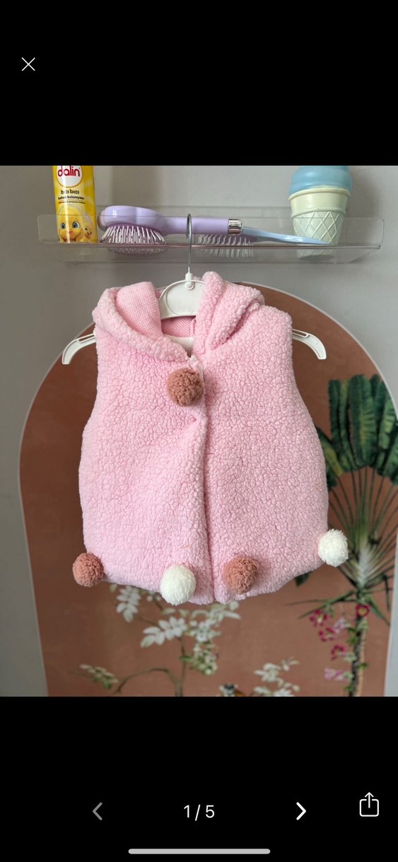 Pastel pembe renkte, kapüşonlu ve kolsuz kız çocuk yeleği. Yumuşak ve sıcak kumaş, kürk detaylı ve nakışlı desenlere sahip. Rahat kesim, trend sokak stili için uygun.