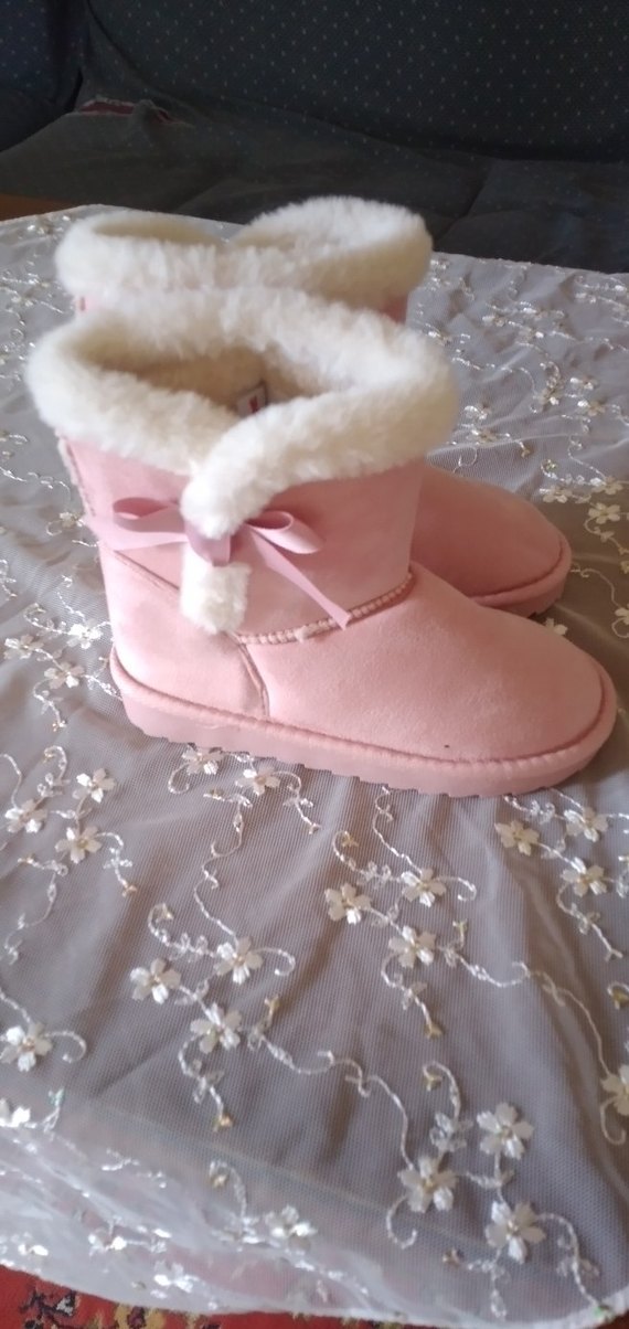Yurtdışından geldi.Numara belli olmadığı için mezuro ile ölçüm çocuklar için yumuşak pembe botlar, sıcak peluş astar ve kürk detaylıdır. Arkada küçük fiyonk bulunur. Pastel tonlarda, desensiz tasarım.
