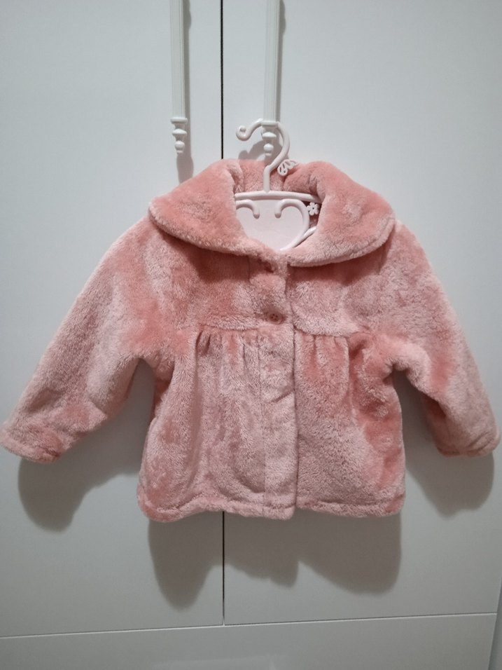 Kız çocuk için pembe, peluş, kürk detaylı, geniş kesim ceket. Yaka tipi kesik yakalı, soğuk günler için uygun. ❄️ yakasında leke var fazla beli değil