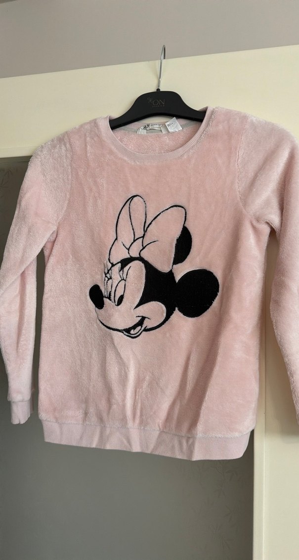 Pembe peluş kumaştan, uzun kollu ve yuvarlak yakalı kız çocuk sweatshirtü. Baskılı Minnie Mouse figürü ve kürk detayları ile rahat kesim sunar.