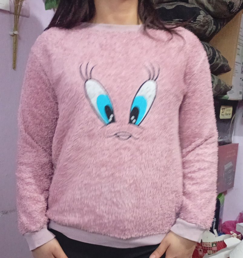 Pembe renkli kız çocuk sweatshirtü, yuvarlak yaka, uzun kollu ve bol kesimdir. Peluş yumuşak dokusu ve nakışlı göz detaylarıyla dikkat çeker.