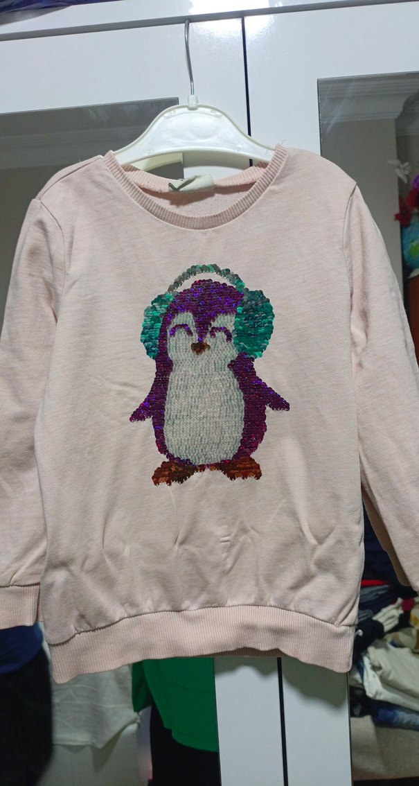 Pembe renkli kız çocuk sweatshirtü, bisiklet yaka ve uzun kolludur. Triko dokusu ve rahat kesimiyle, renkli penguen baskısı ve pul detayları içerir.