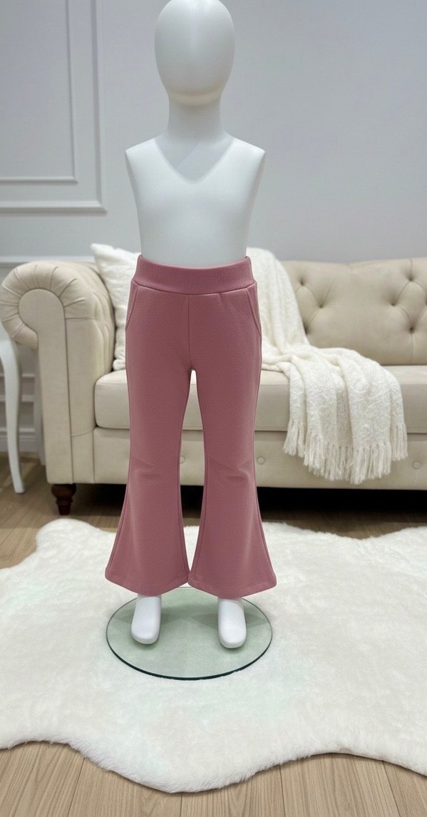 Kız çocukları için pilili, bol kesim ve yumuşak, sıcak kumaştan yapılmış pembe pantolon. Pastel tonlarda, desensiz sade tasarım.