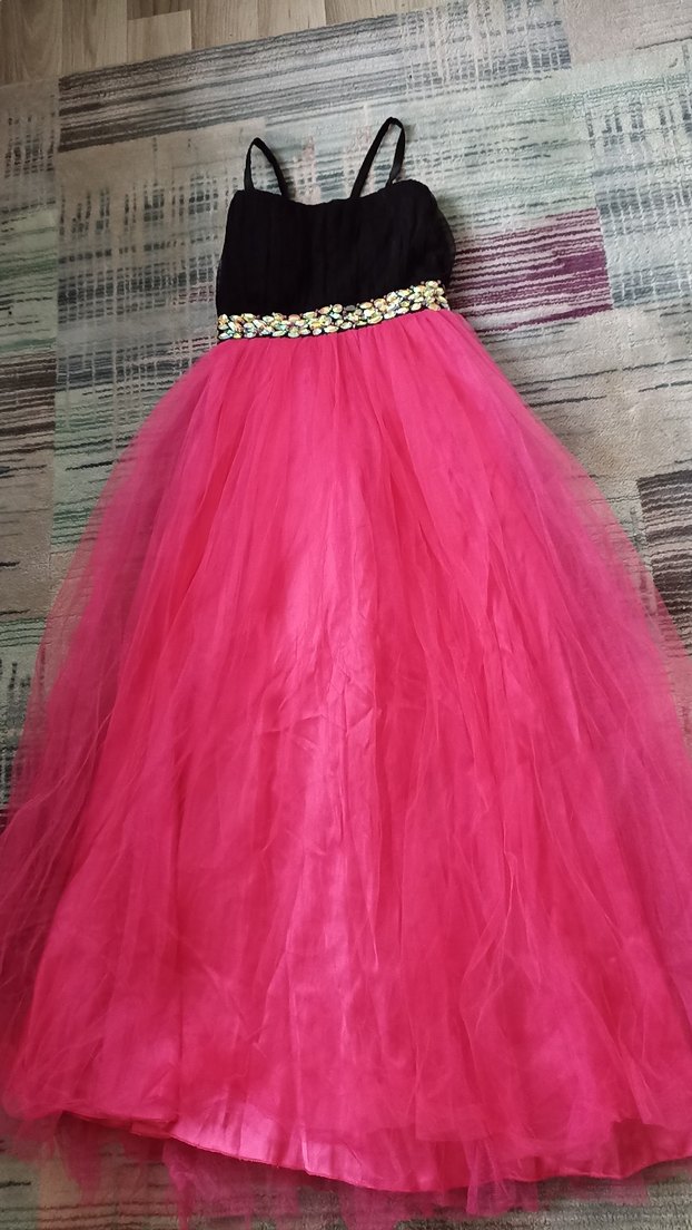 Siyah askılı straplez üst kısmı ve canlı pembe pilili eteği olan, belinde renkli detaylı süslemeye sahip, fitted kesim kız çocuk elbisesi.