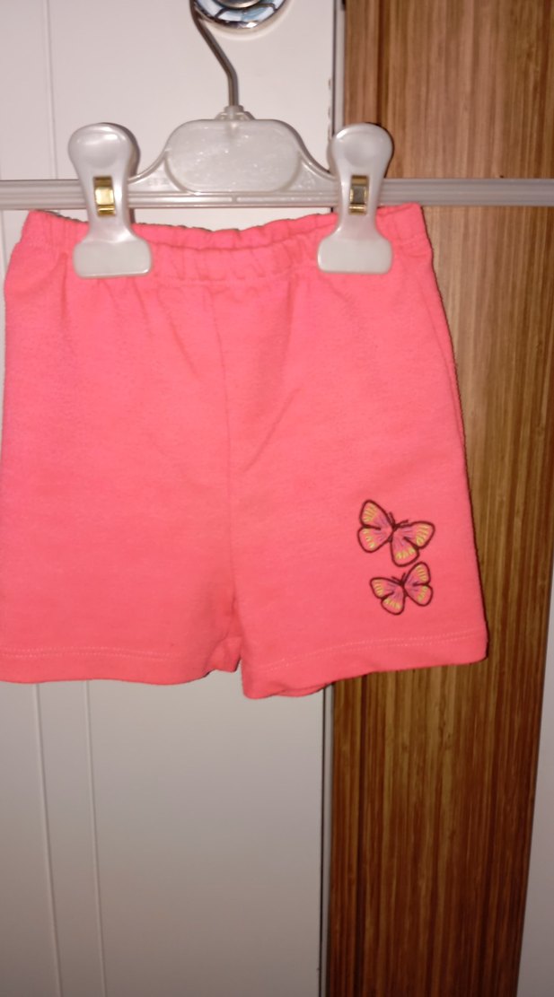 Yumuşak ve sıcak kumaştan, bol kesim pembe şort, elastik bel ve kelebek desenleriyle.