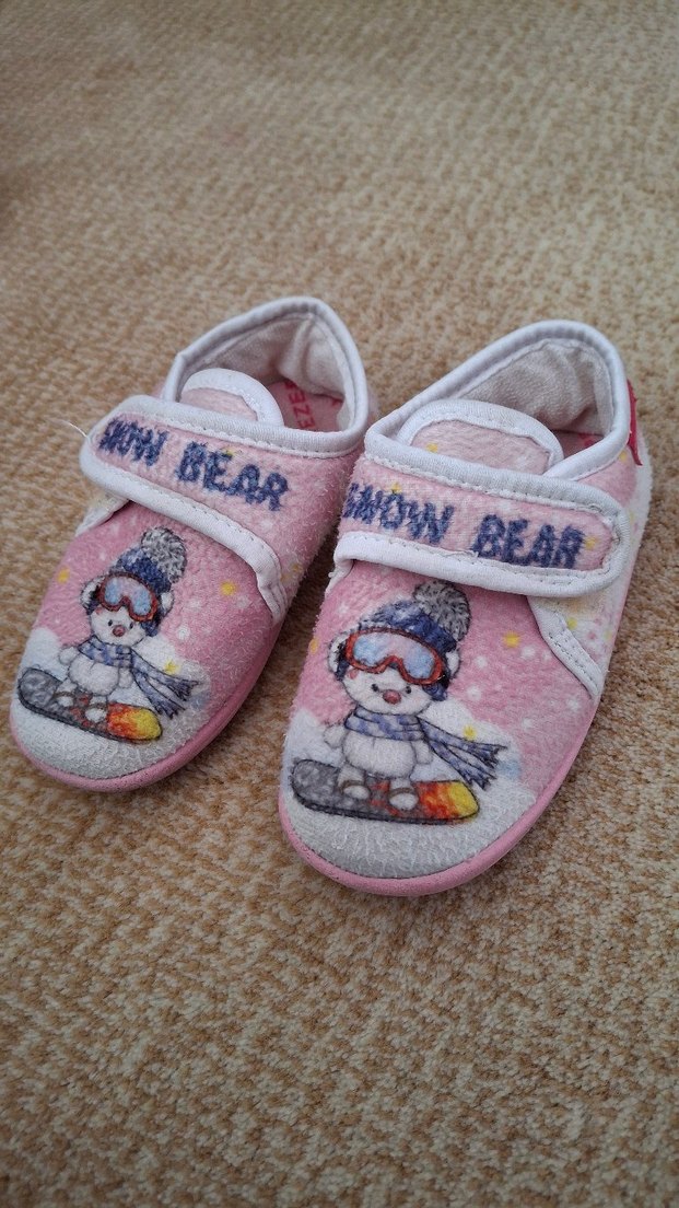 Kız çocukları için pembe polar terlikler üzerine baskılı desen ve kolay kullanım için Velcro bant içerir. İç mekanlarda sıcaklık ve konfor sağlar. ❄️
