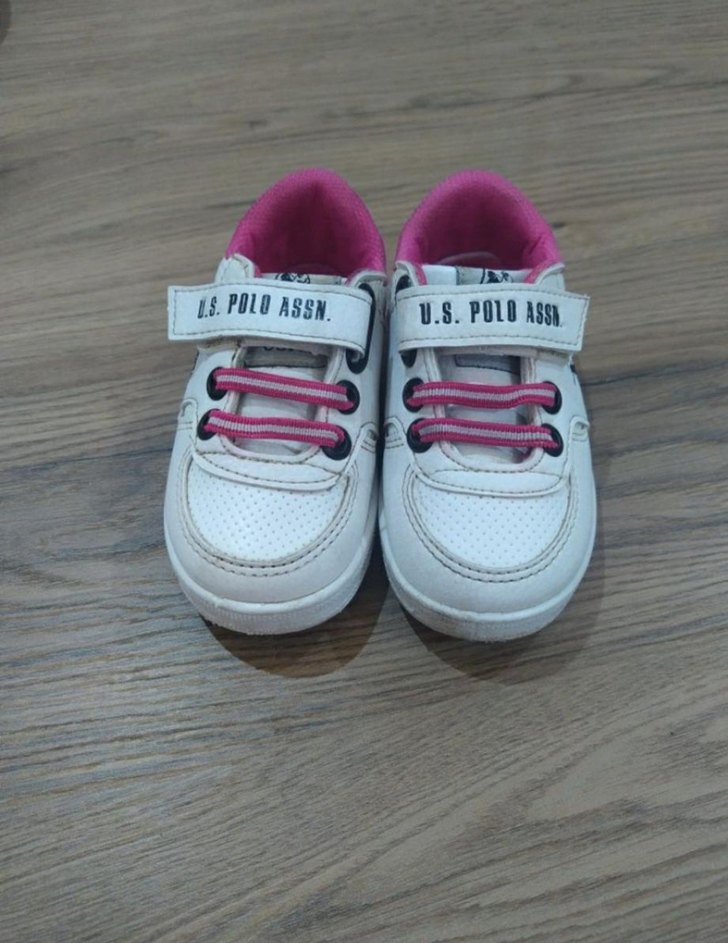 U.S. Polo Assn. marka, pembe renkli, baskılı detaylı ve velcro bantlı kız çocuk spor ayakkabısı.