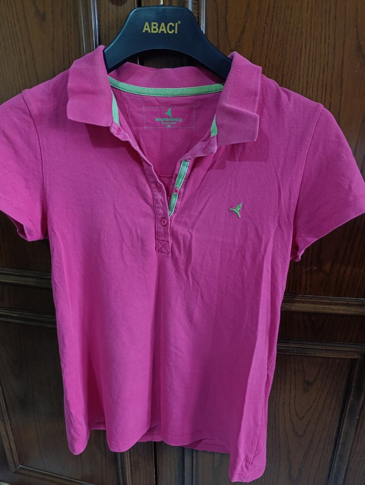 Dar kesim, kısa kollu pembe kız çocuk polo tişört. Yaka kısmında düğmeli yeni gibi