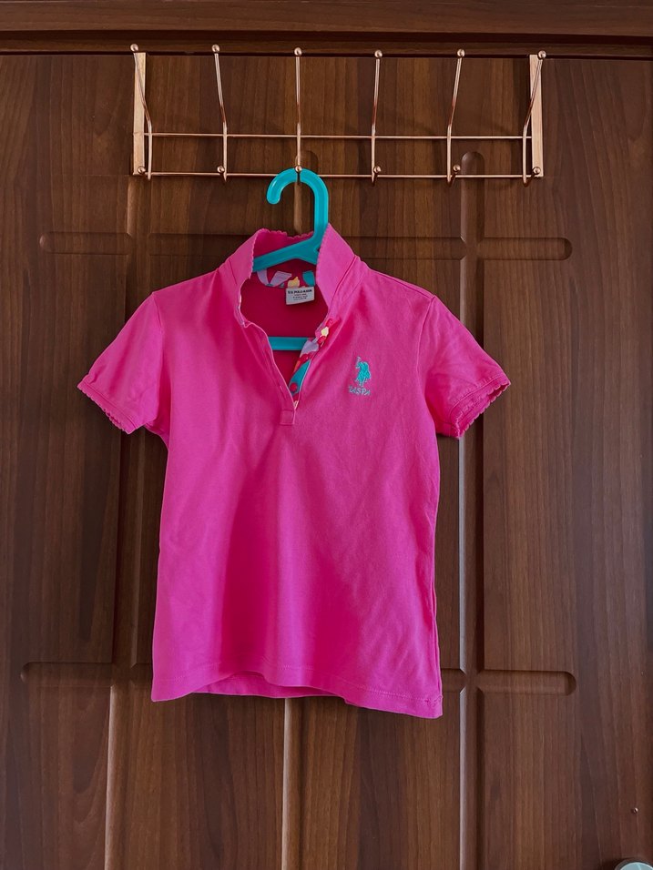 Kız çocukları için pembe, kısa kollu, düğmeli ve baskılı polo yaka tişört. Yumuşak ve sıcak dokulu, rahat sokak stili için uygundur.
