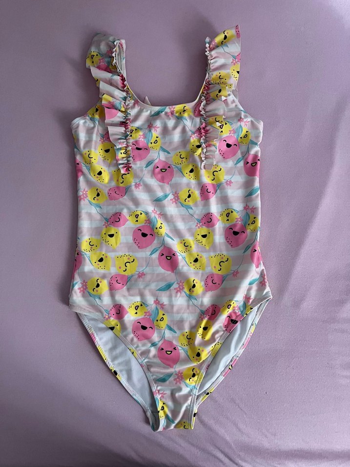 Kolsuz, pastel pembe tonlarında tie-dye ve neşeli pop art desenlere sahip kız çocuk mayosu, omuzlarda fırfır detaylı, plaj için uygun.