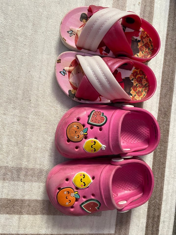 İki adet terlik Pembe kauçuk kız çocuk terlik ve sandalet, renkli baskılı tasarımlı.