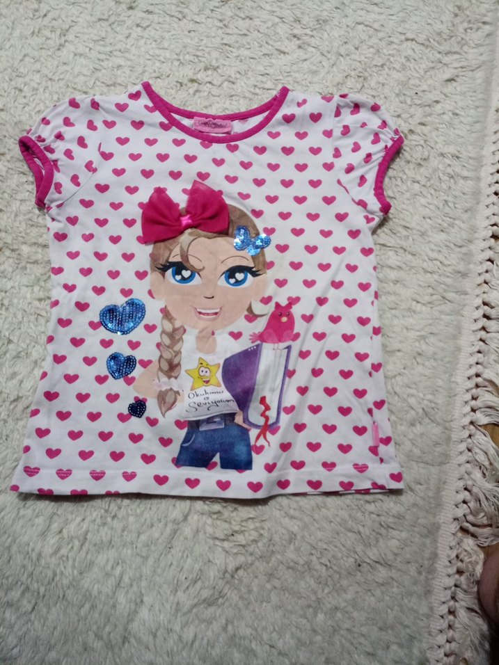Kız çocuk tişörtü, renkli kalp desenleri ve pop kültür karakter baskısına sahip. Kısa kollu, yuvarlak yaka ve bol kesim. Pembe tonlarda, fiyonk detaylı.