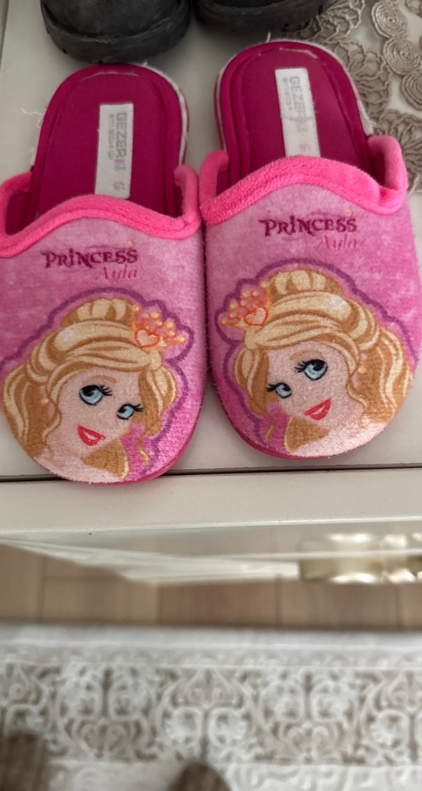 Kız çocukları için pembe polar terlik, renkli prenses desenli ve örgü detaylı. Yumuşak ve sıcak tutar. Küçük kalıptır