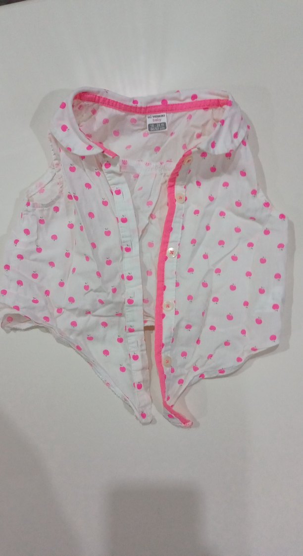 Pamuklu kumaştan, pembe puantiyeli, kolsuz ve düğmeli kız çocuk gömleği. Straplez yakalı ve vücuda oturan kesime sahip.