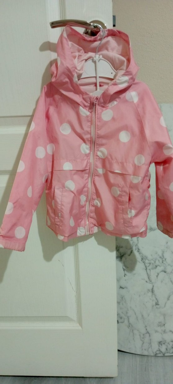 Kız çocukları için pastel pembe, beyaz puantiyeli, çıtçıtlı, notched yakalı, bol kesim yağmurluk. Sentetik kumaştan, trend sokak stili için uygundur. ☔