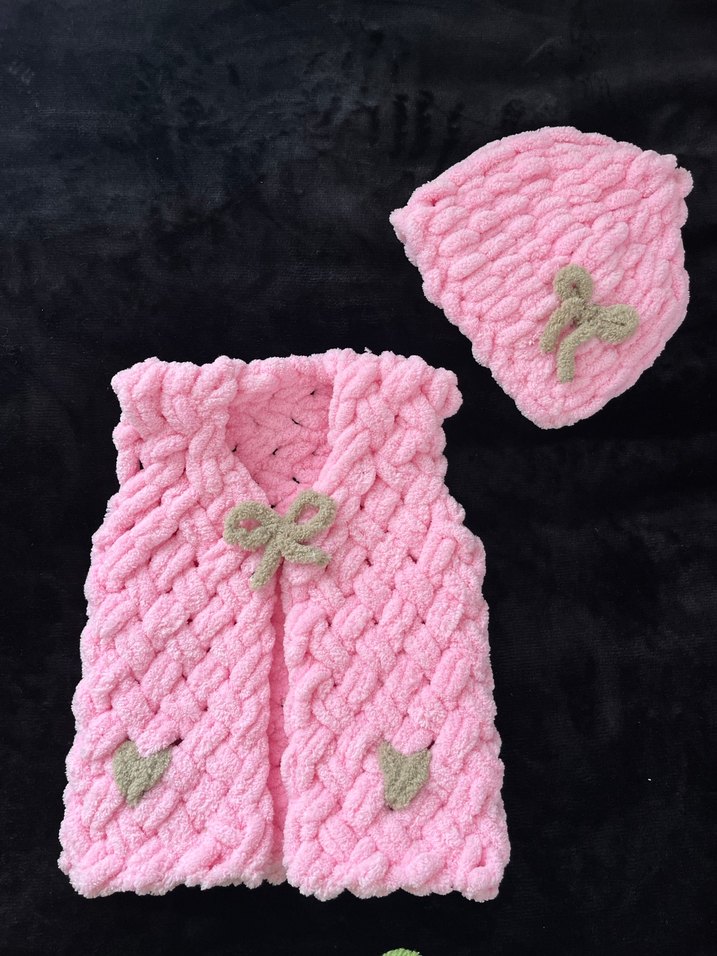 Pembe renkli, kız çocuk örgü yelek, nakışlı kalpler ve fiyonk detaylıdır. Aynı kumaştan bere ile set halinde sunulur. İstenen ölçü renk model yapılır