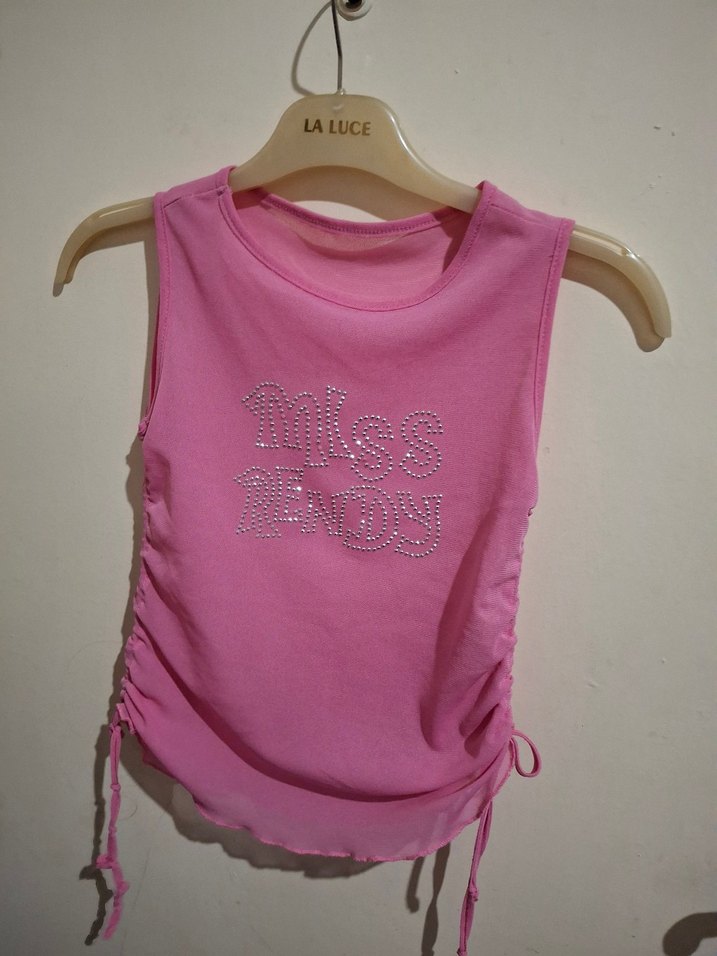 Pembe renkli, pul işlemeli, baskılı ve fit oturan kız çocuk kolsuz atlet, sokak modasına uygun şık bir parça.
