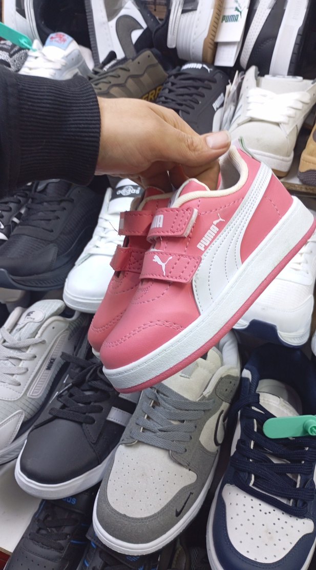Kız çocukları için pembe Puma spor ayakkabı, renkli desenli ve cırt cırtlı bantlı, kauçuk tabanlı sokak stili ayakkabı.