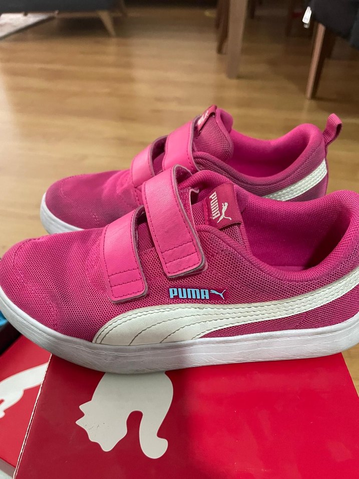 Pembe renkli, baskılı desenli Puma kız çocuk spor ayakkabısı. Cırt cırtlı ve kauçuk tabanlı, sokak stili için uygun.