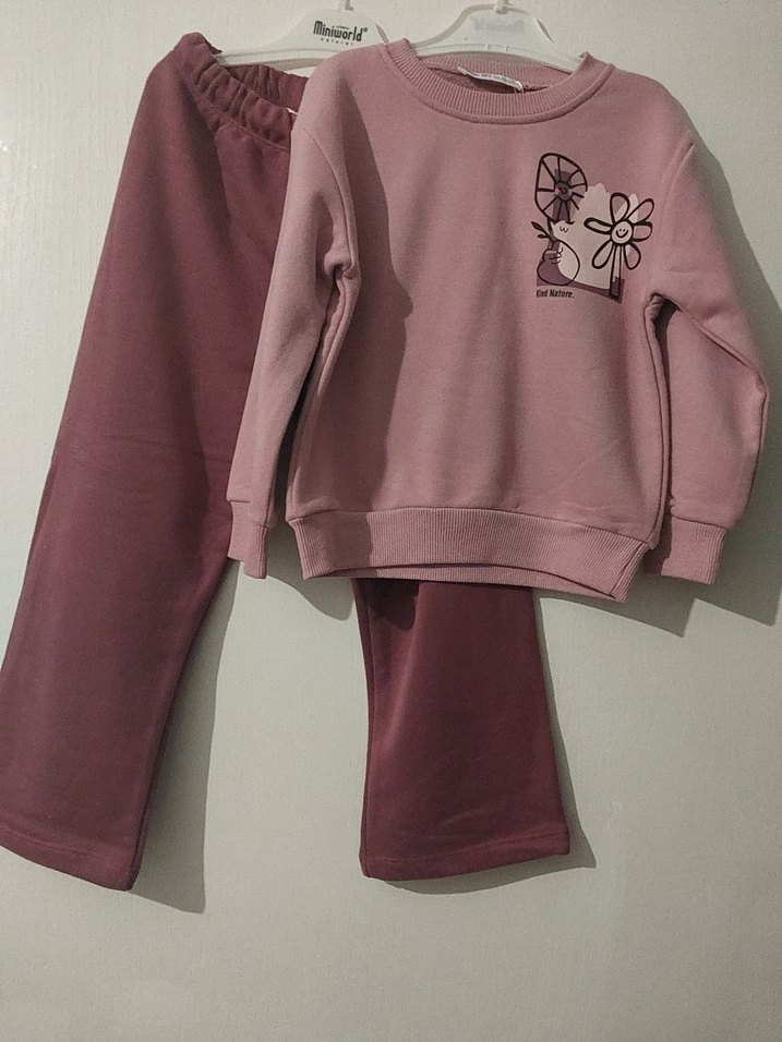 Kız çocukları için pembe renkli, bol kesim, uzun kollu ve yuvarlak yaka sweatshirt ile eşofman takımı. Pastel tonu ve sade tasarımıyla rahat ve şık bir görünüm sunar. elimde sadece 4 yası mevcuttur