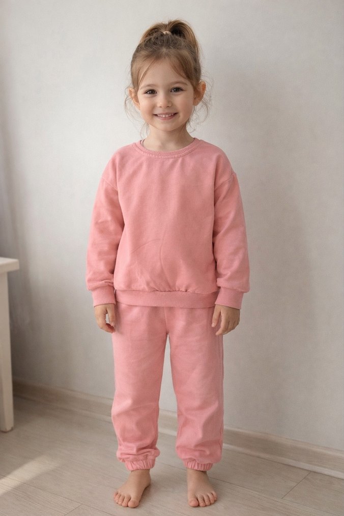 Kız çocukları için bol kesim, pastel pembe renkli, bisiklet yaka ve uzun kollu takım. Yumuşak ve sıcak kumaştan rahat ve sade bir stil sunar. 2/7 yaş arası