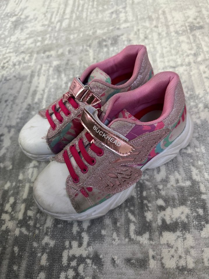 Kız çocuklarına özel, renkli tie-dye desenli pembe spor ayakkabılar. Bağcıklı ve tokalı tasarımı ile rahat kullanım sunar…