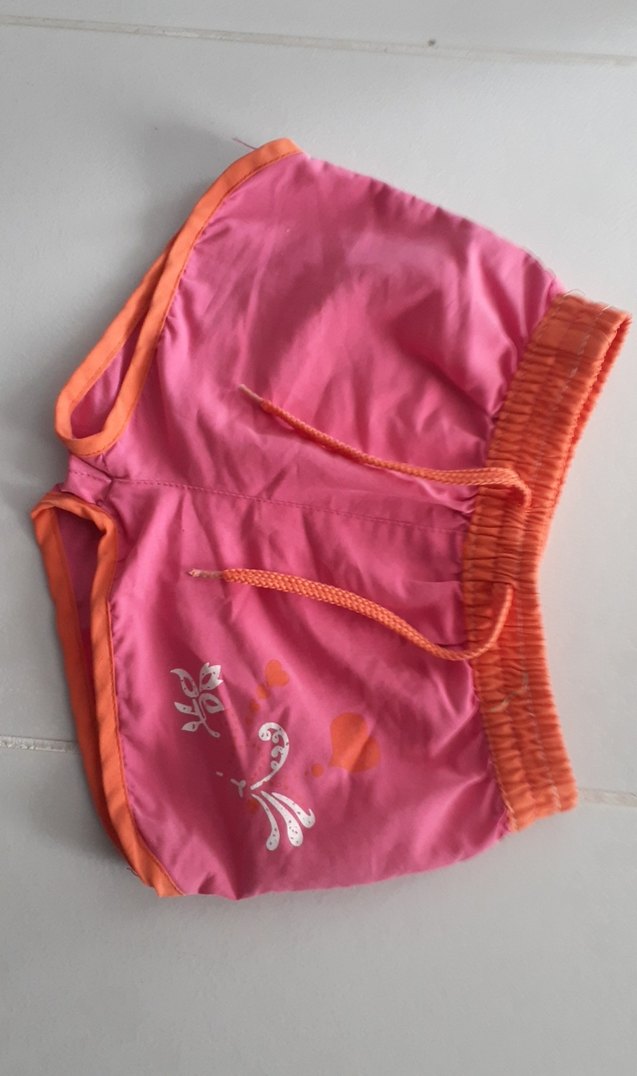 Kız çocukları için pembe, renkli baskılı, sentetik kumaştan yapılmış, fermuarlı cepli ve bağcıklı şort. Rahat elastik bel bandına sahip.