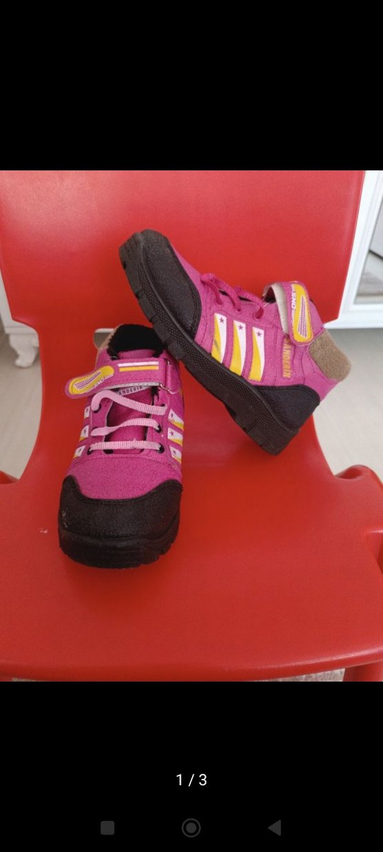 Kız çocukları için renkli baskılı, pembe tonlarda ve sarı detaylı spor ayakkabılar. Kauçuk tabanlı ve kolay kapanan cırt cırtlı bantlıdır.