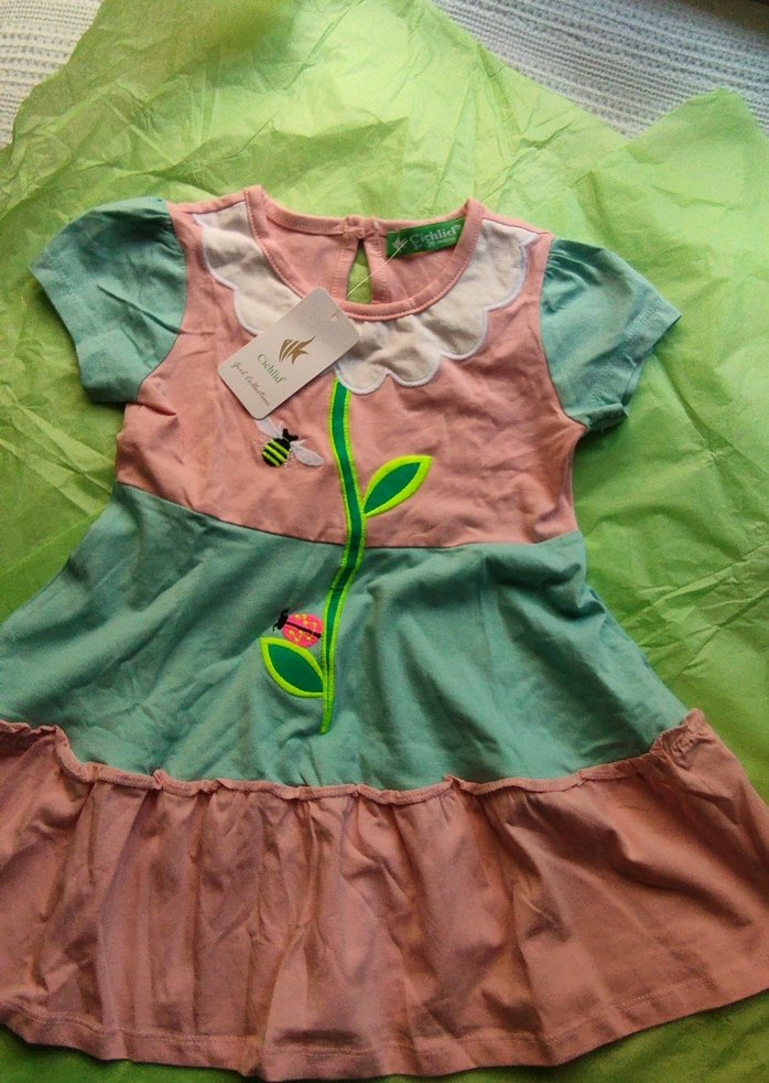 Kısa kollu, bisiklet yaka ve pastel renklerde, arı ve çiçek baskılı kız çocuk elbisesi. Etek ucu fırfır detaylıdır.