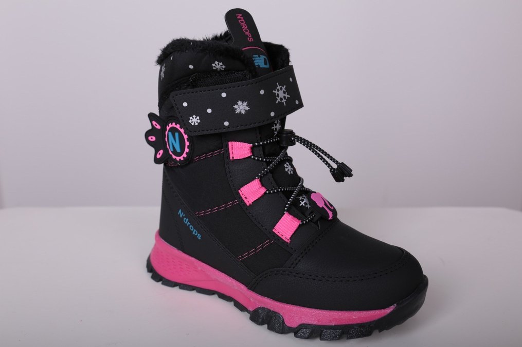 Kız çocukları için pembe renkli, baskılı kar tanesi desenli, kaymaz tabanlı, cırt cırtlı botlar. Trendy ve rahat sokak stili için uygundur. ❄️
