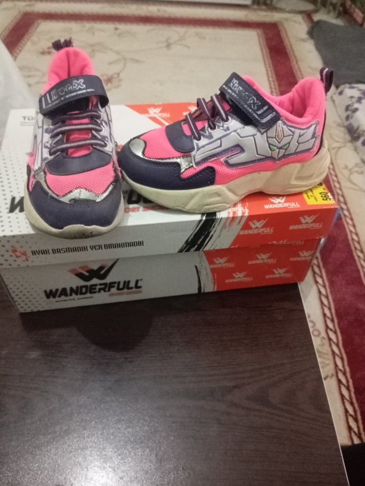 Renkli pembe kız çocuk spor ayakkabısı, cırt cırtlı ve baskılı desenli, rahat kauçuk tabanlı. Marka: Wanderfull.