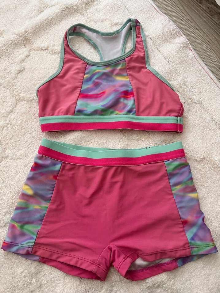 Kız çocukları için kolsuz, pembe renkli tie-dye desenli spor bikini. Yarış sırtı üst ve uyumlu şortları bulunur. Kısa süre kullnıldı 6 7 yaş için uygun