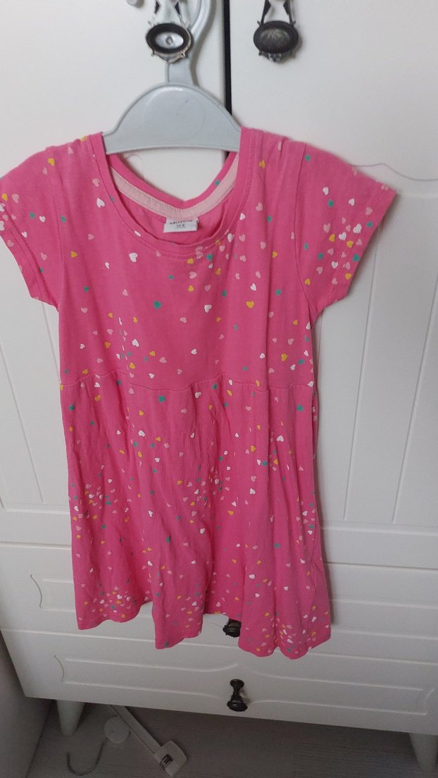 Pembe renkli kız çocuk elbisesi, kısa kollu ve V yakalıdır. Renkli baskılar ve fırfır detaylarıyla rahat ve şık bir sokak stili sunar.