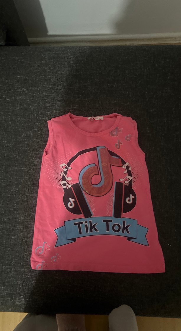 Renkli Tik Tok baskılı, örgü dokulu sentetik kumaştan yapılmış, yuvarlak yaka, salaş kesim ve kolsuz kız çocuk pembe atlet.