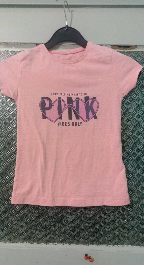 Kız çocuk tişörtü, kısa kollu ve bisiklet yaka. Yumuşak sentetik kumaştan, pastel pembe renkli, rock punk baskılı ve 'DON'T TELL ME WHAT TO DO' ile 'VIBES ONLY' yazılıdır.