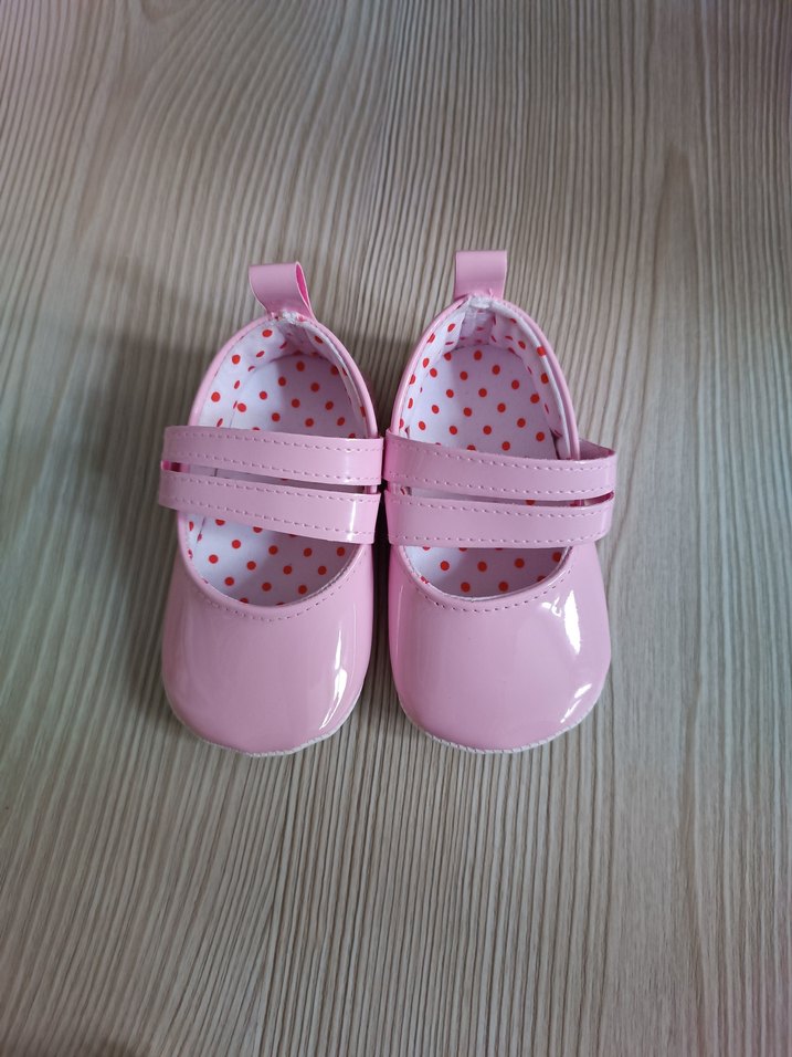 Kız çocukları için pembe rugan babet ayakkabı, tokalı bantlı ve yumuşak kauçuk tabanlıdır. İç kısmında renkli puantiye deseni bulunur.
